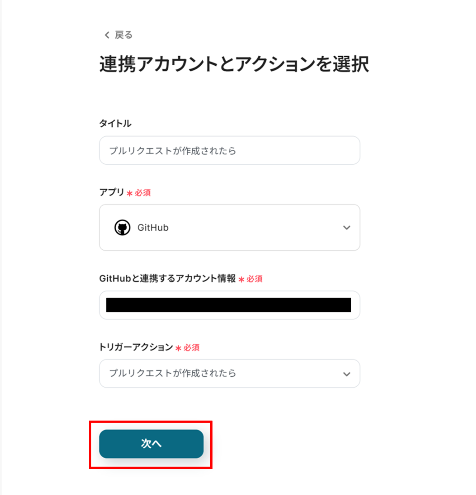 今回使用するアカウント情報で誤りがないかを確認し、トリガーアクションは「プルリクエストが作成されたら」のままにして「次へ」をクリックしましょう。