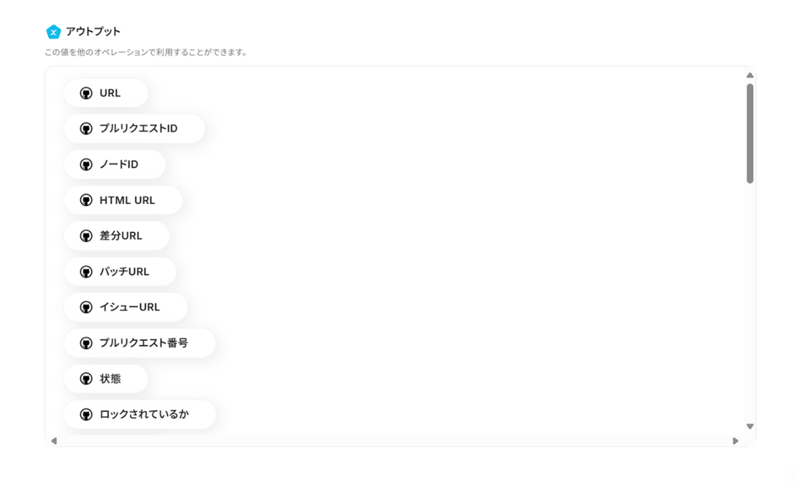 テストが成功すると、GitHubで先ほど作成したプルリクエストの情報がアウトプットとして取得できます。