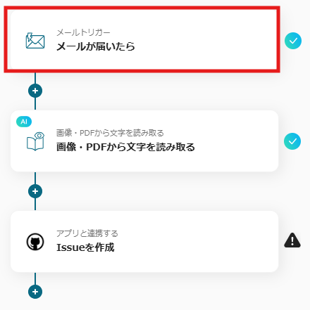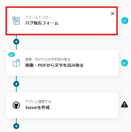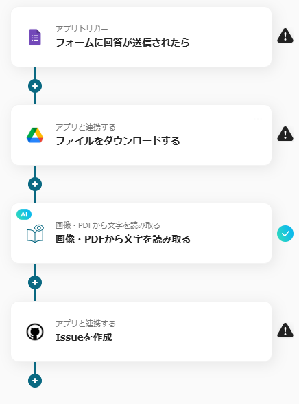※こちらの画面は、Yoomページ画面左側「マイプロジェクト」のフローボットで表示される、「【コピー】Googleフォームの添付ファイルをOCRして、GitHubでIssueを作成する」をクリックすると表示されます。