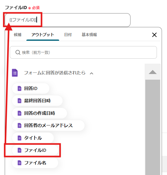 2.「ファイルID」は、入力欄下の説明に従って入力するか、入力欄をクリックして表示されるアウトプットから選択できます。