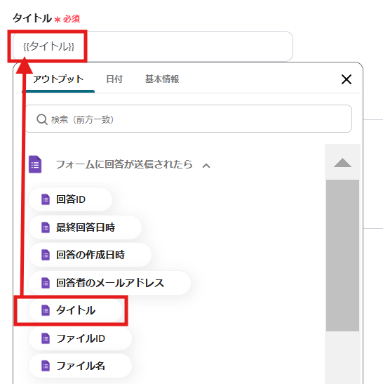 「タイトル」は、入力欄をクリックして表示されるアウトプットから選択してください。
