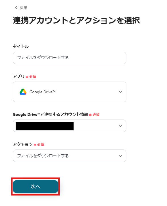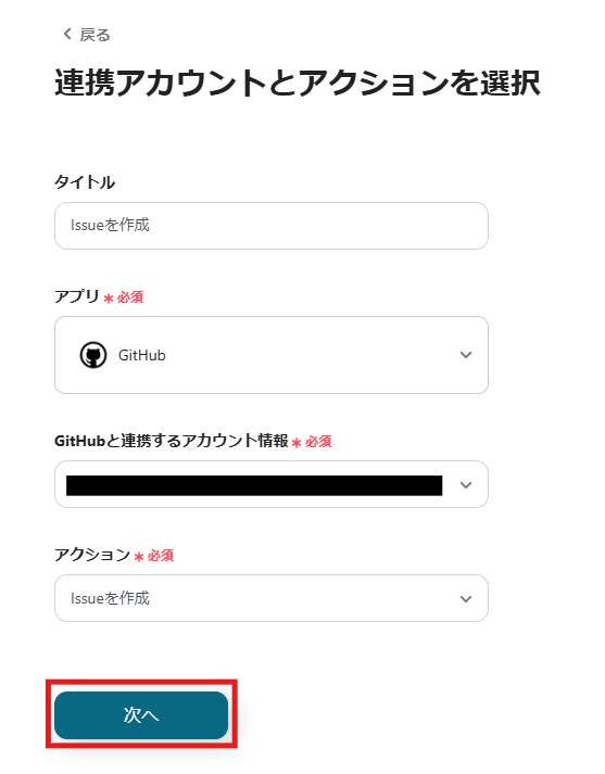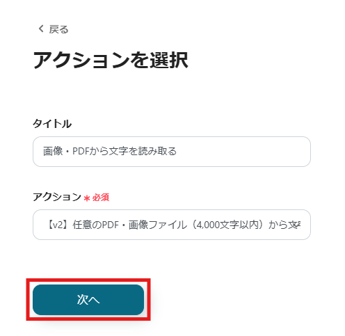 表示された画面で必須項目を入力します。アクションはそのままにして、「次へ」をクリックしましょう。