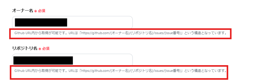 「オーナー名」「リポジトリ名」は、入力欄下の説明に従って、入力してください。