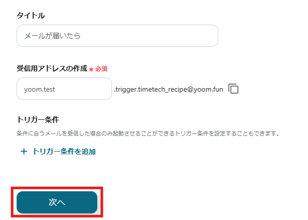 2.表示された画面で必須項目を入力します。トリガーアクションはそのままにして、「次へ」をクリックしましょう。