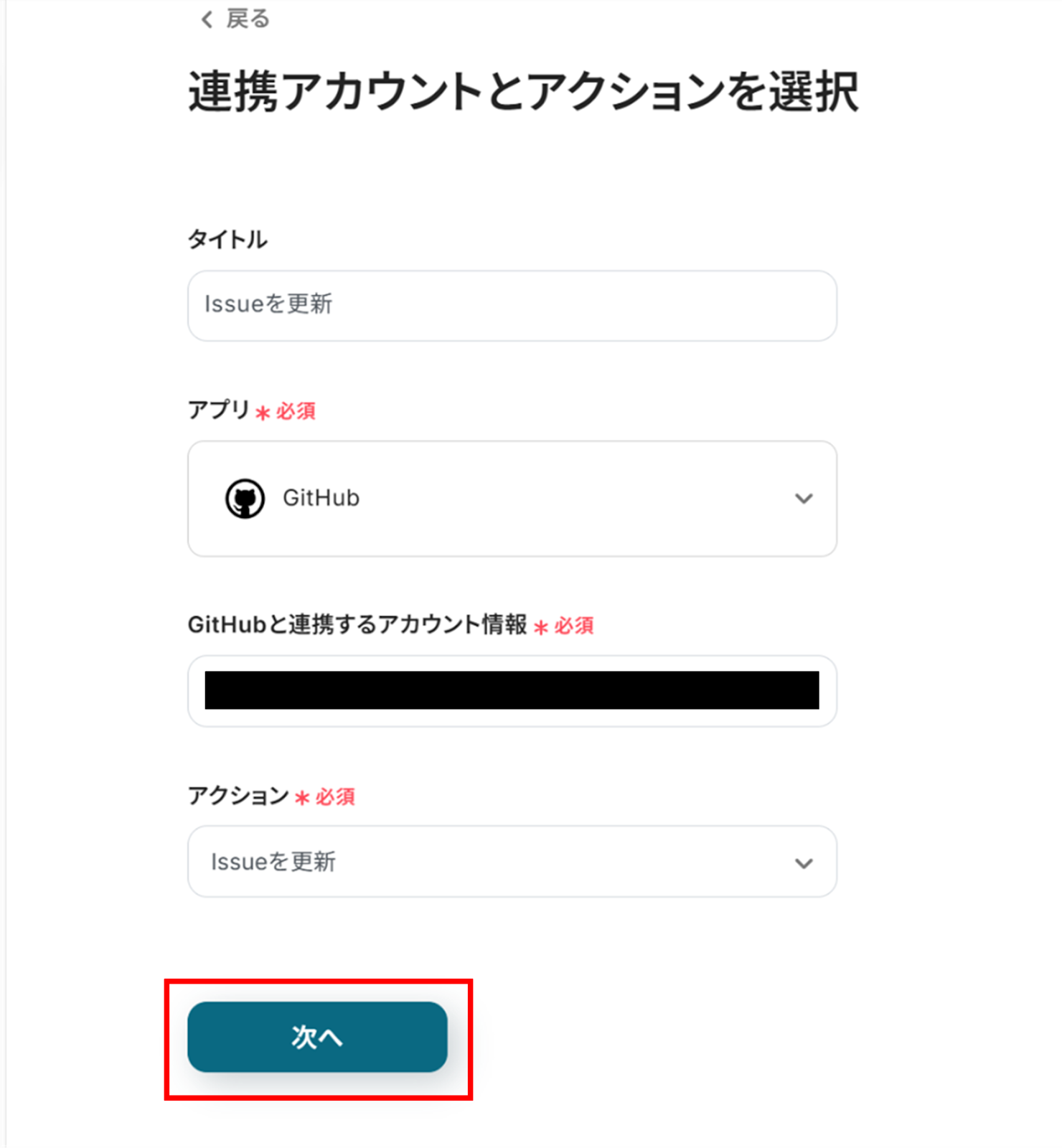 (2)GitHubの「連携アカウントとアクションを選択」画面から、GitHubと連携するアカウント情報に誤りがないかを確認し、アクションは「Issueを更新」のままで「次へ」をクリックします。