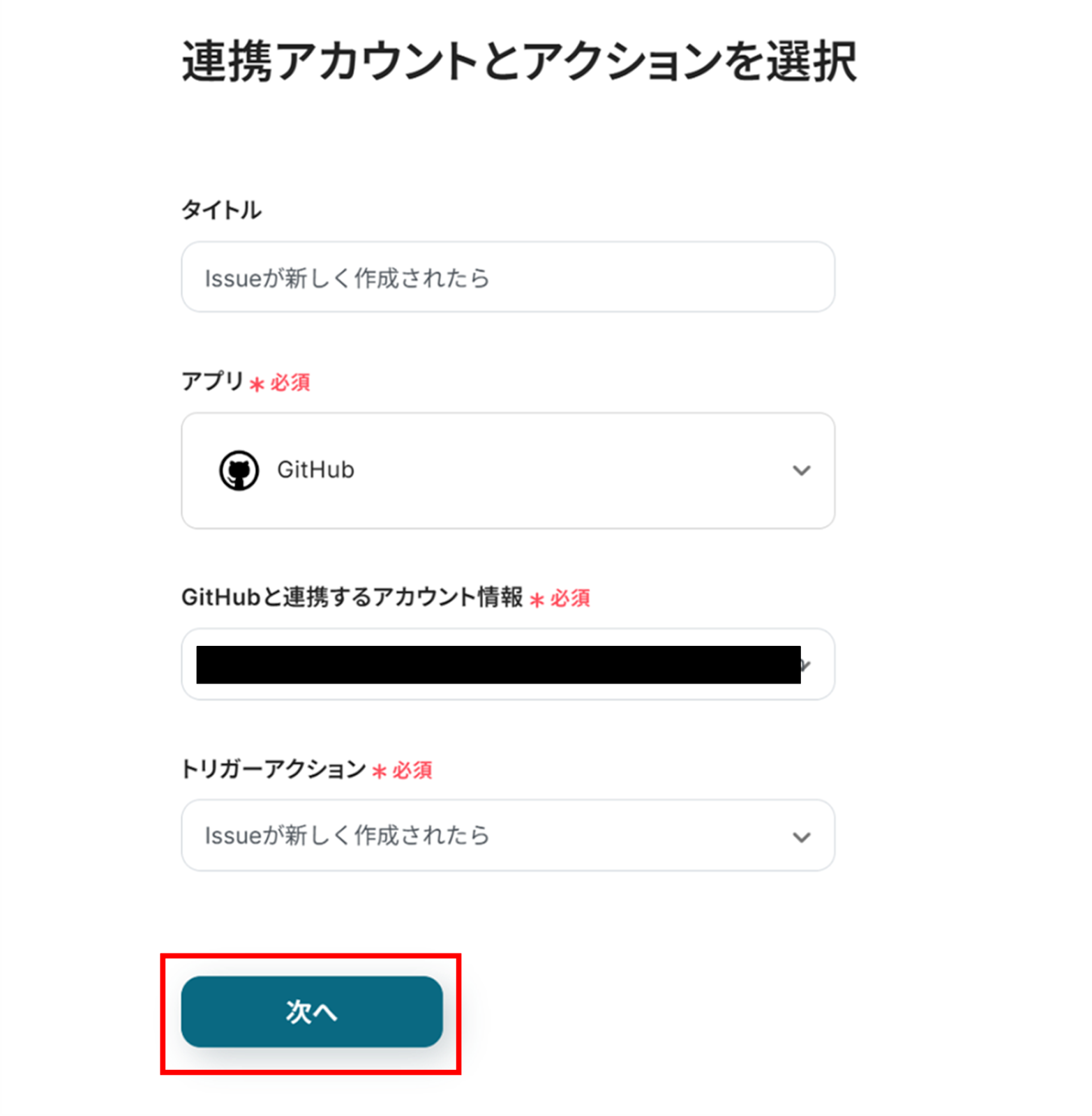 (2)GitHubの「連携アカウントとアクションを選択」画面から、GitHubと連携するアカウント情報に誤りがないかを確認し、トリガーアクションは「Issueが新しく作成されたら」のままで「次へ」をクリックします。