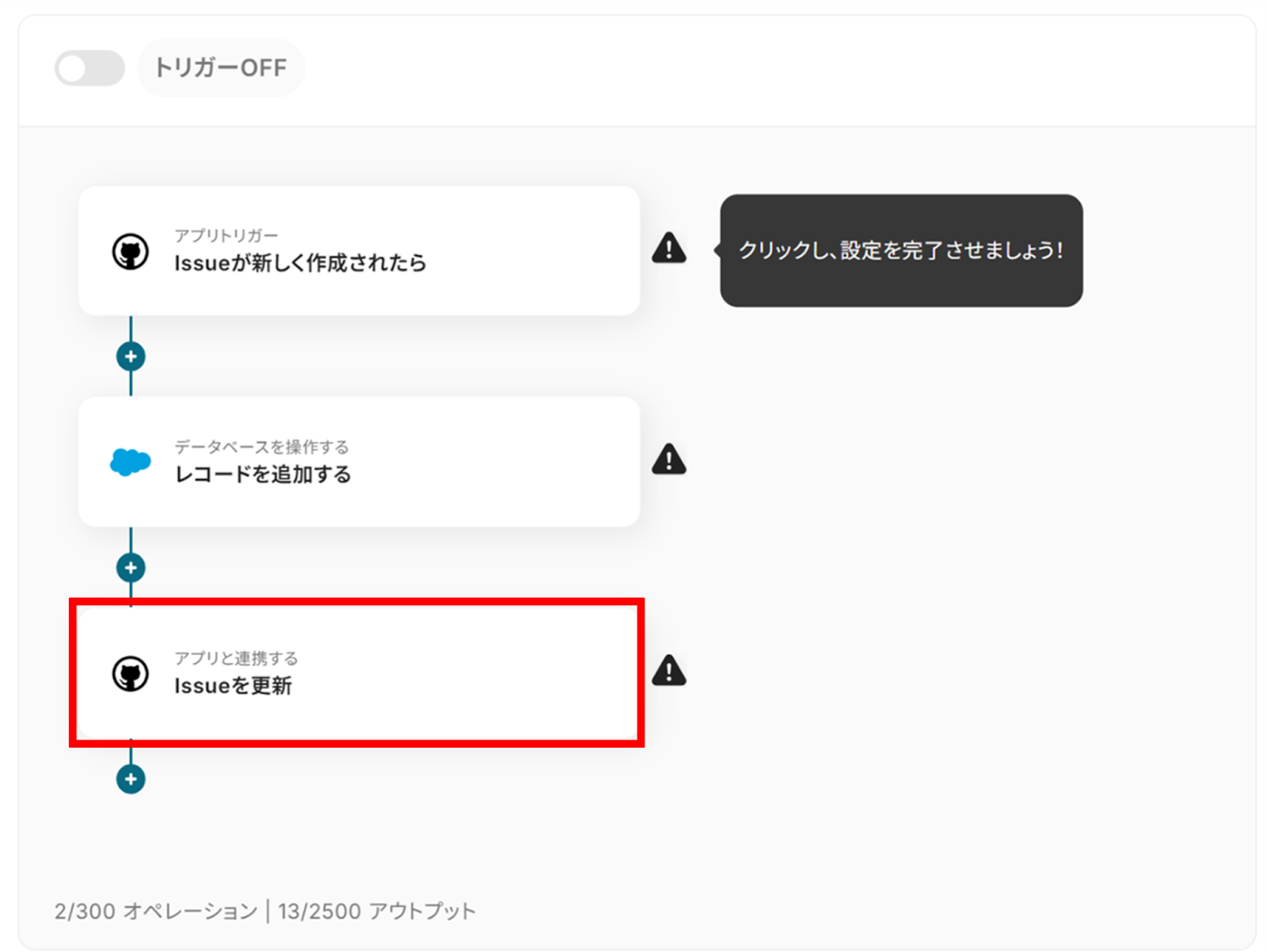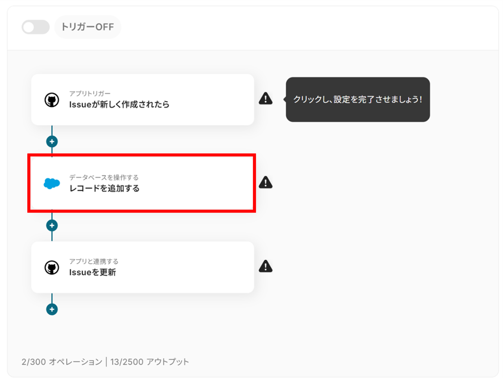 ・「同じ処理を繰り返す」オペレーション間の操作、Salesforceはチームプラン・サクセスプランでのみご利用いただけるアプリとなっております。フリープラン・ミニプランの場合は設定しているフローボットのオペレーションやデータコネクトはエラーとなりますので、ご注意ください。