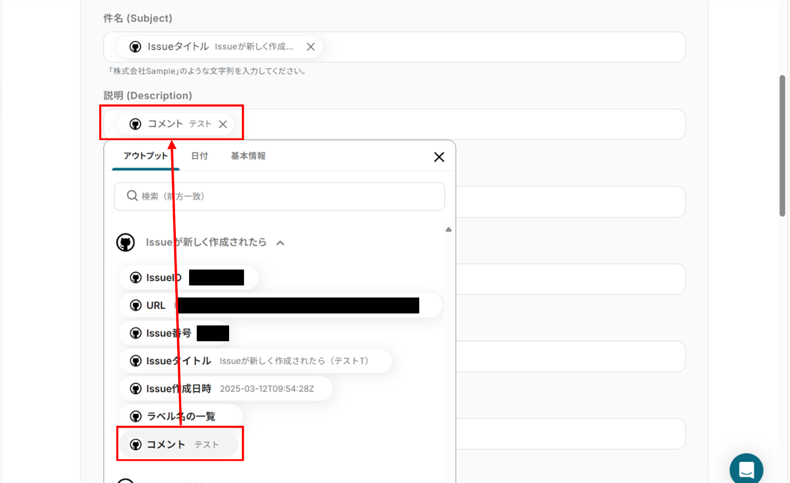 下へ進み、イシュー番号、タイトル、コメント内容をアウトプットを使って入力します。