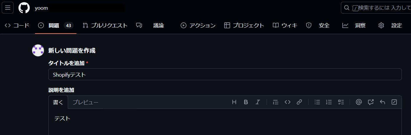GitHubの画面に移動し、テスト用にIssueを作成しましょう。