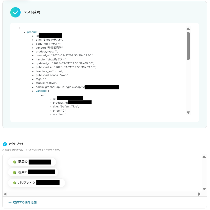 アウトプットはこの後の設定で活用するので、間違いがないか確認してください。