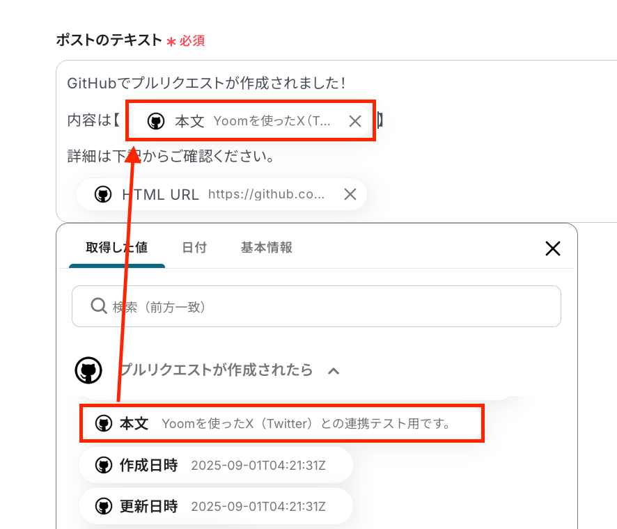 たとえば、「GitHubでプルリクエストが作成されました」など毎回同じ文章を使用する定型的なテキストは直接入力し、GitHubの情報を引用したい部分は取得した値を使って入力してくださいね!