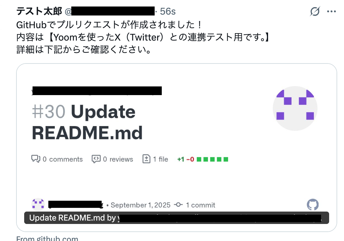この連携を設定することで、プルリクエストが作成されたら、そのタイトルやURLを含む情報を自動でX(Twitter)にポストし、開発の進捗をタイムリーに関係者に共有できるでしょう。