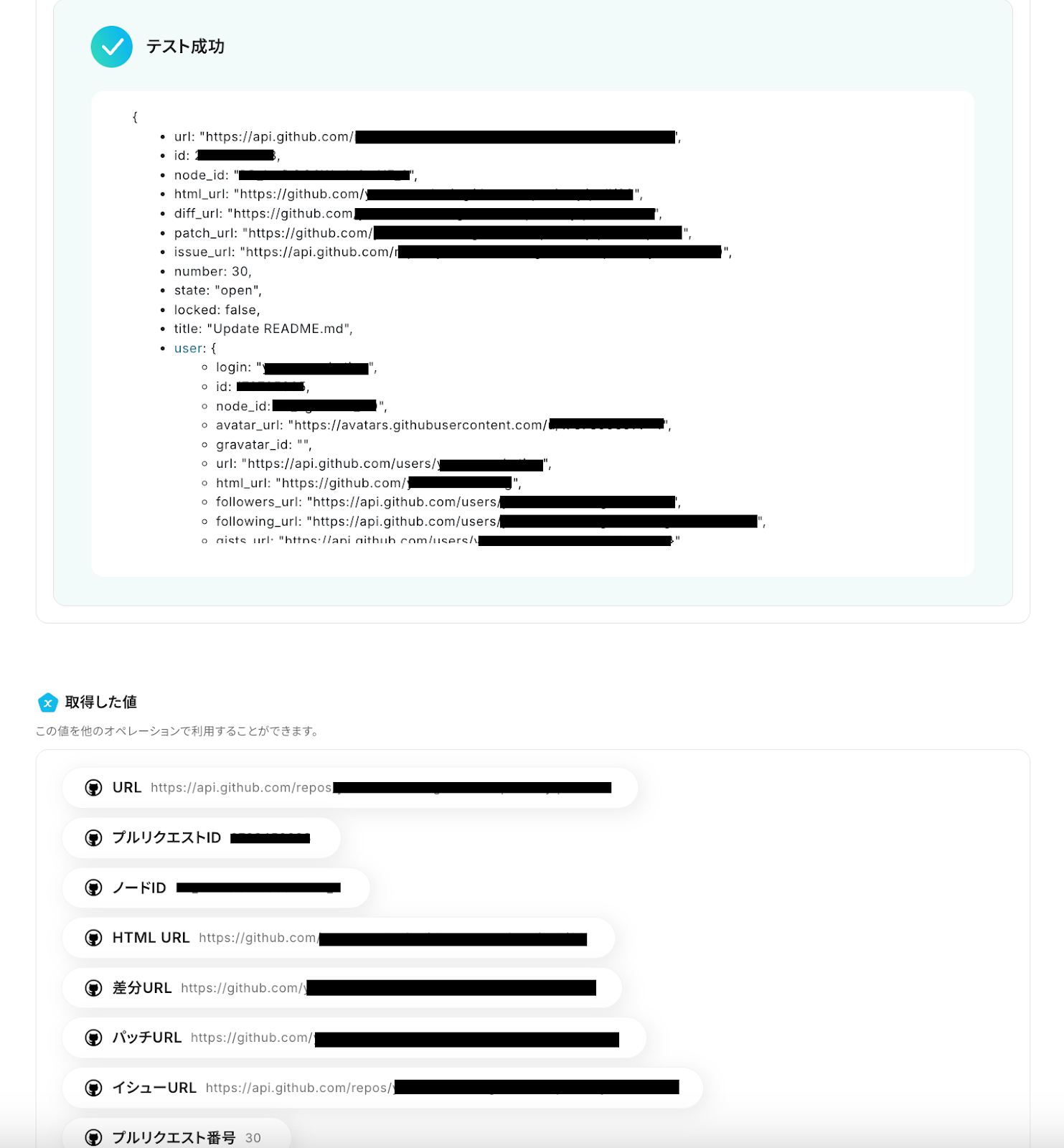 テストが成功すると、先ほど作成したプルリクエストの情報が「取得した値」に取得した値として抽出されるので、内容を確認してくださいね!