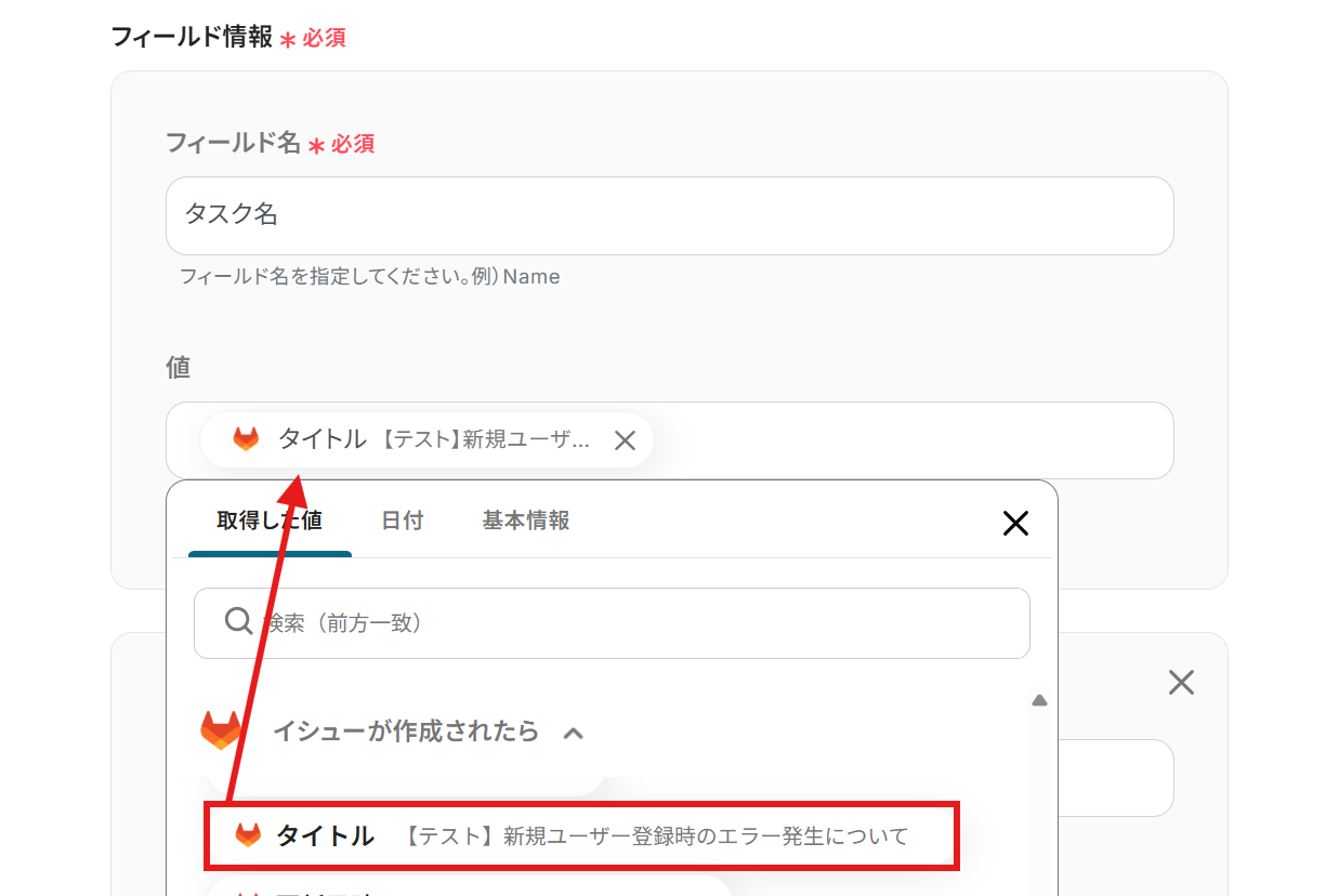 値: 入力欄をクリックすると、GitLabから取得した情報を引用できます。今回はタスク名をGitLabから取得した「タイトル」にしています。 ※手入力してしまうと、同じデータが何度もAirtableに登録されてしまうので、気をつけましょう。