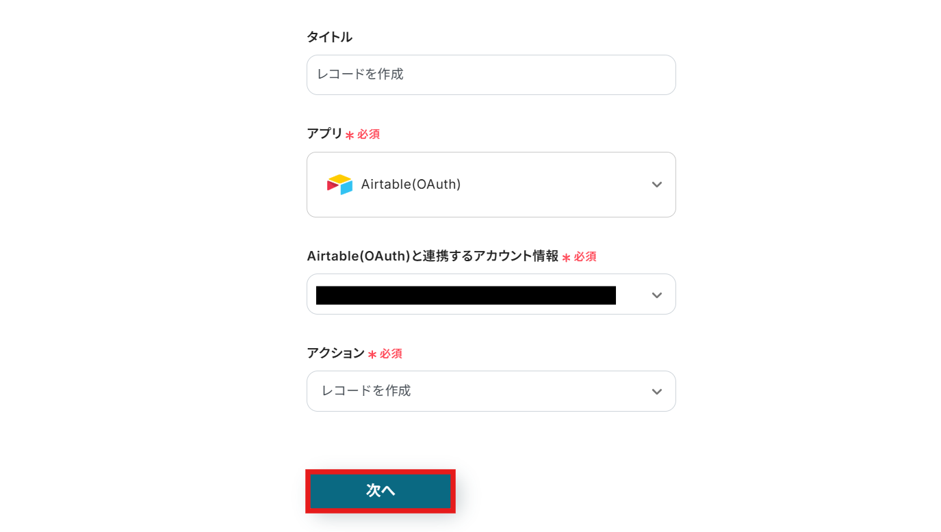 先ほどと同じように設定していきましょう。アクションに「レコードを作成」を選んだら、「次へ」をクリックします。