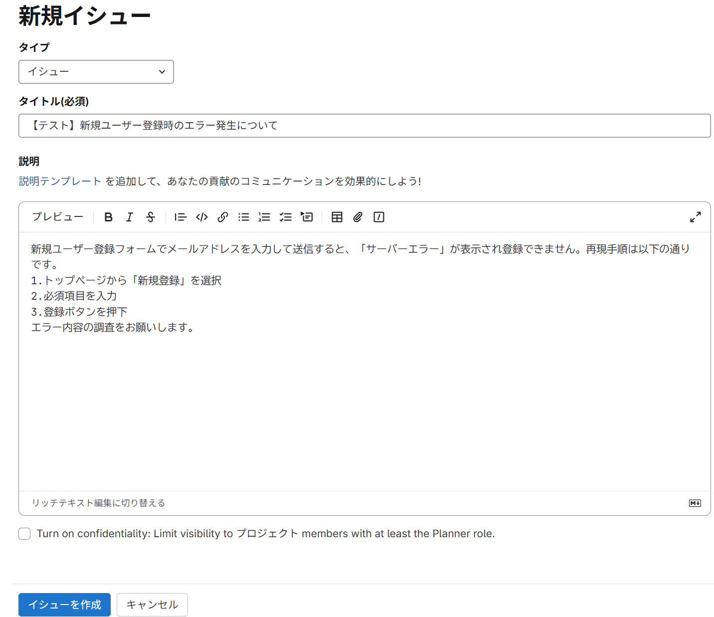 設定が終わったら、テストのためGitLabの画面でイシューを作成します。 今回は以下のように作成しました。