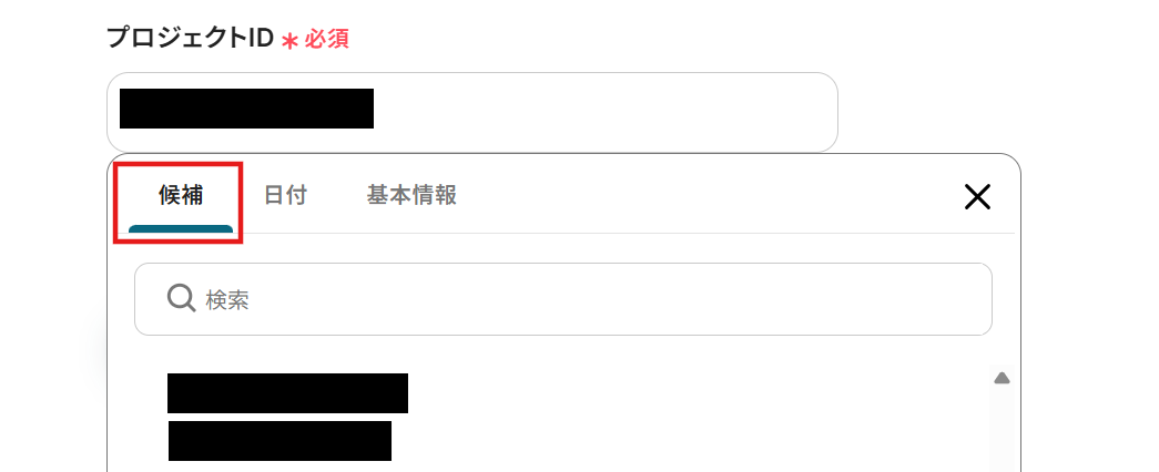 プロジェクトID: 入力欄をクリックすると候補が表示されるので、その中から選択しましょう。もし候補がうまく表示されない場合は、マイアプリ連携の設定をもう一回チェックしてみてください。また、こちらの記事 も参考にしてみてくださいね。