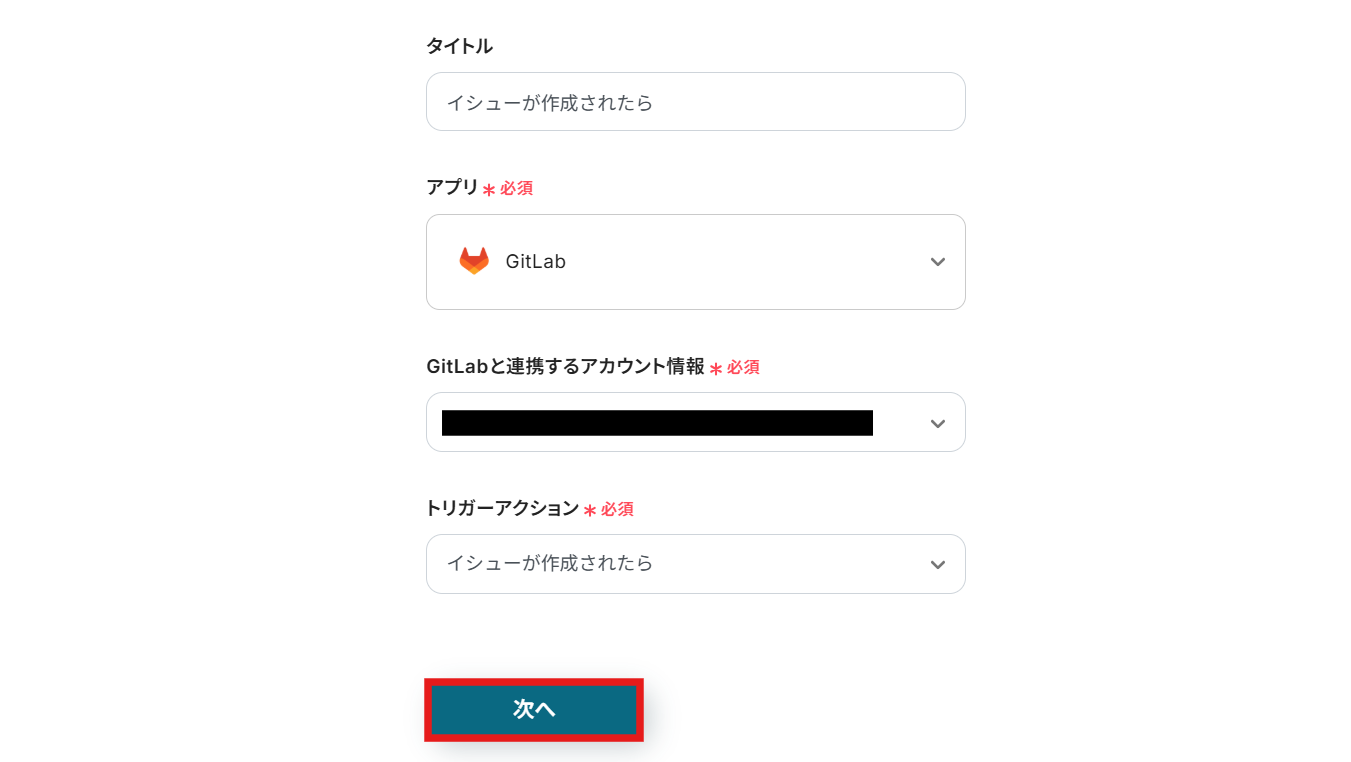 GitLabと連携するアカウント情報はプルダウンから選択します。 トリガーアクションには「イシューが作成されたら」を選びましょう。 入力が終わったら、「次へ」を押して進めてください。
