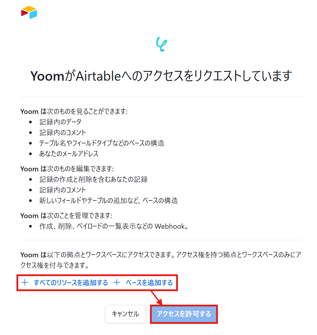 2. アクセスのリクエスト画面が表示されます。 「すべてのリソースを追加する」か、「ベースを追加」からアクセス権を付与するワークスペースを選択し、「アクセスを許可する」をクリックしましょう。