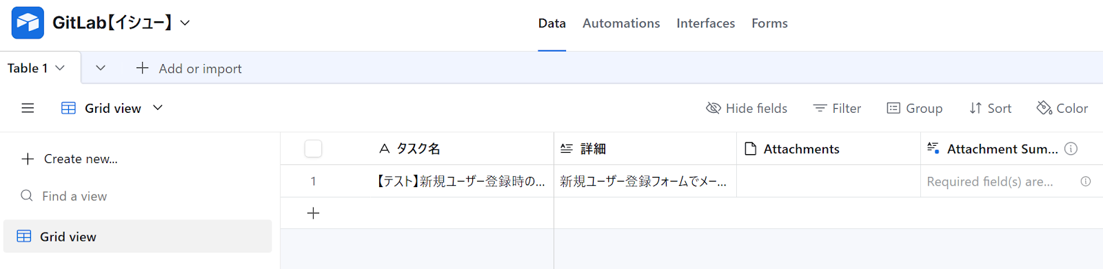 この連携により、GitLabで新しいイシューが作成されると、そのタイトルや説明などの情報が自動でAirtableのレコードとして追加されます。