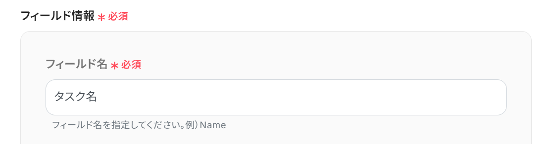 フィールド名: テーブルの列の見出しの部分を入力しましょう。今回は事前に作成したデータベースに「タスク名」があるので、以下のように設定しています。