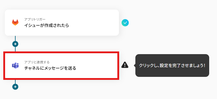 続いて、GitLabでIssueが作成されたことをMicrosoft Teamsに自動通知する設定を行います。 以下の赤枠の「チャネルにメッセージを送る」をクリックしてください。