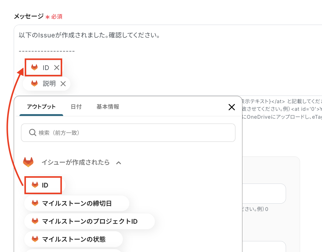 毎回、固定で同じテキストを使用しても問題ないテキストについては、定型文として固定値を入力します。(たとえば、「以下のIssueが作成されました。確認してください。」など) Issueごとの内容に合わせて変動する値で通知したい部分は、アウトプットを用いて設定しましょう。(たとえば、「IssueのID」や「説明」など)