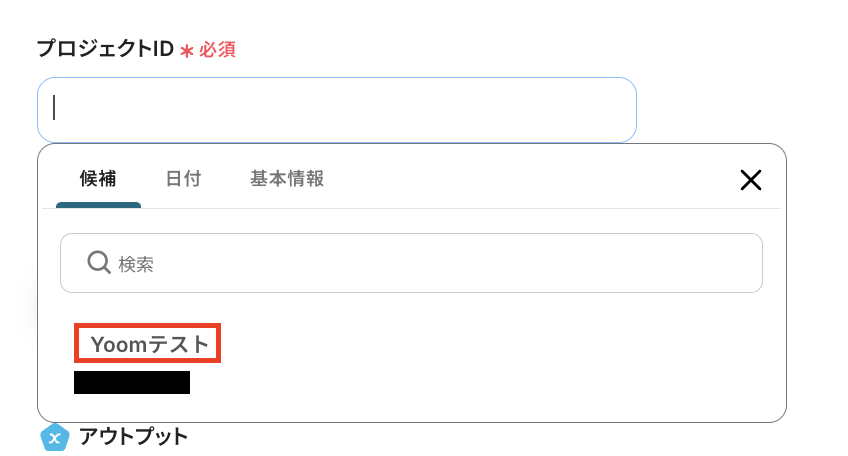 続いて、「プロジェクトID」を入力します。 「プロジェクトID」欄をクリックすると、連携しているアカウントから候補が表示されるので、候補から選択しましょう。
