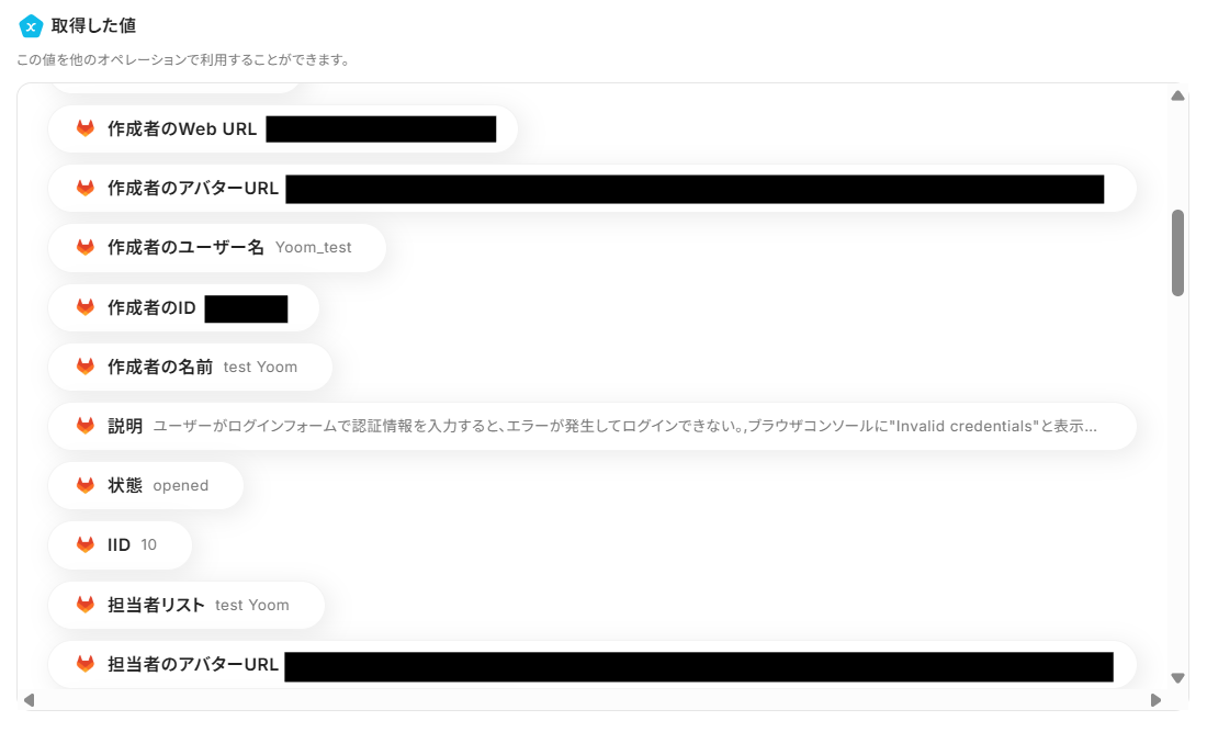 アカウント情報の項目にはステップ1でマイアプリ連携したGitLabのアカウント情報が自動で表示されます。
