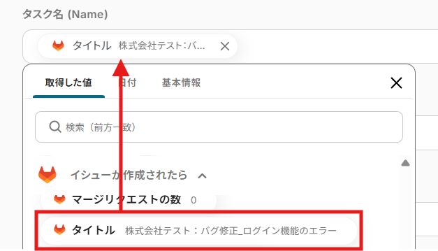 編集欄をクリックし、「イシューが作成されたら」の項目から、GitLabで作成したイシュー情報を引用できます。それぞれ対応する項目を選択してください。