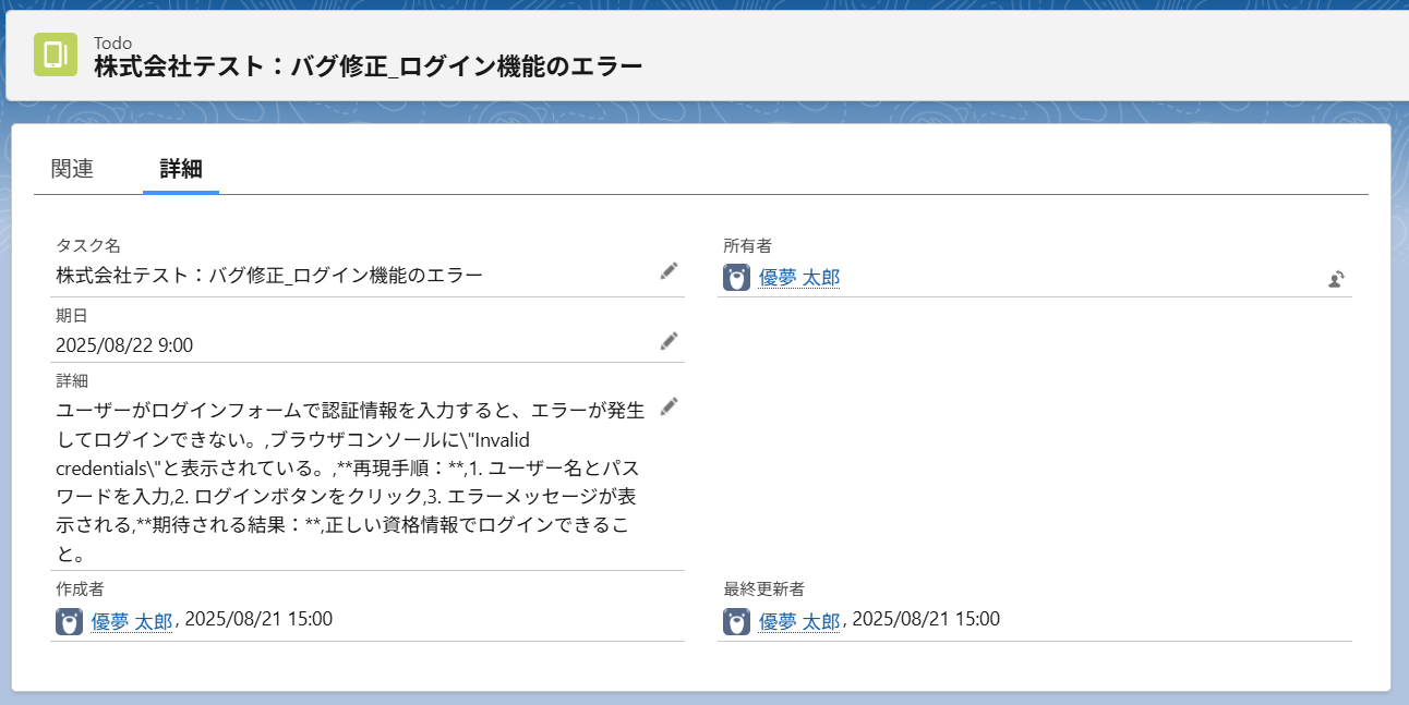 GitLabでイシューが作成されると、Salesforceで指定した「タスク」や「商談」などのレコードが自動で追加されます。