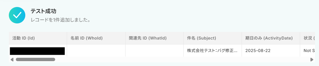 ここまでの入力が完了したら、テストを実行してください。テストが成功し、以下の画面が表示されます。