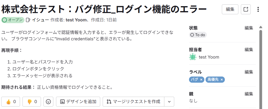 イシューを作成したら、Yoomの操作画面に戻ります。