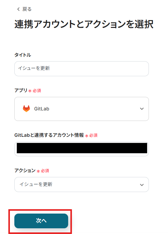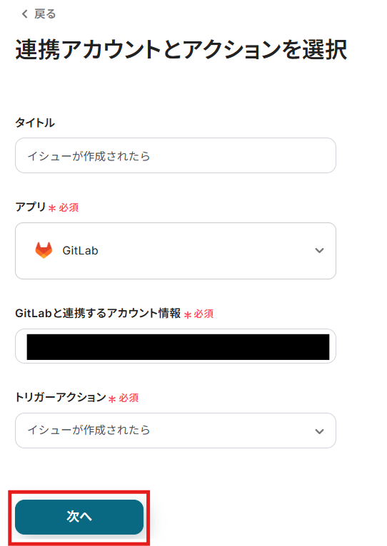 アカウント情報の項目にはステップ1でマイアプリ連携したGitLabのアカウント情報が自動で表示されます。