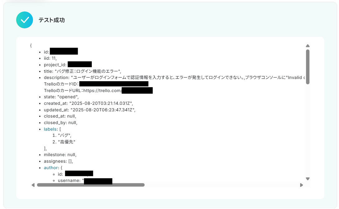テストが成功し、作成したイシューの情報が表示されたら、「保存する」をクリックして完了です!