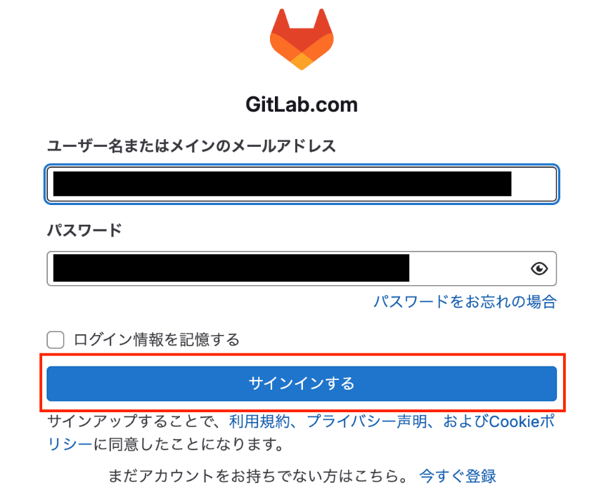 連携させたいGitLabの「ユーザー名またはメインのメールアドレス」と「パスワード」を入力し、「サインインする」をクリックしましょう。