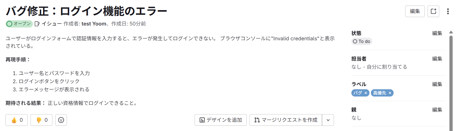 イシューのタイトルは、先ほど作成したGitLabのイシュー情報を基に、テンプレートに自動で設定されています。