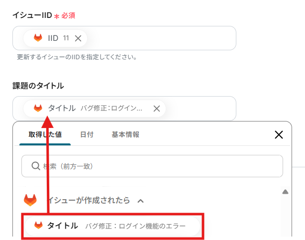 編集欄を クリックし、「イシューが作成されたら」から先ほど作成したGitLabのイシュー情報を引用できるようになっています!