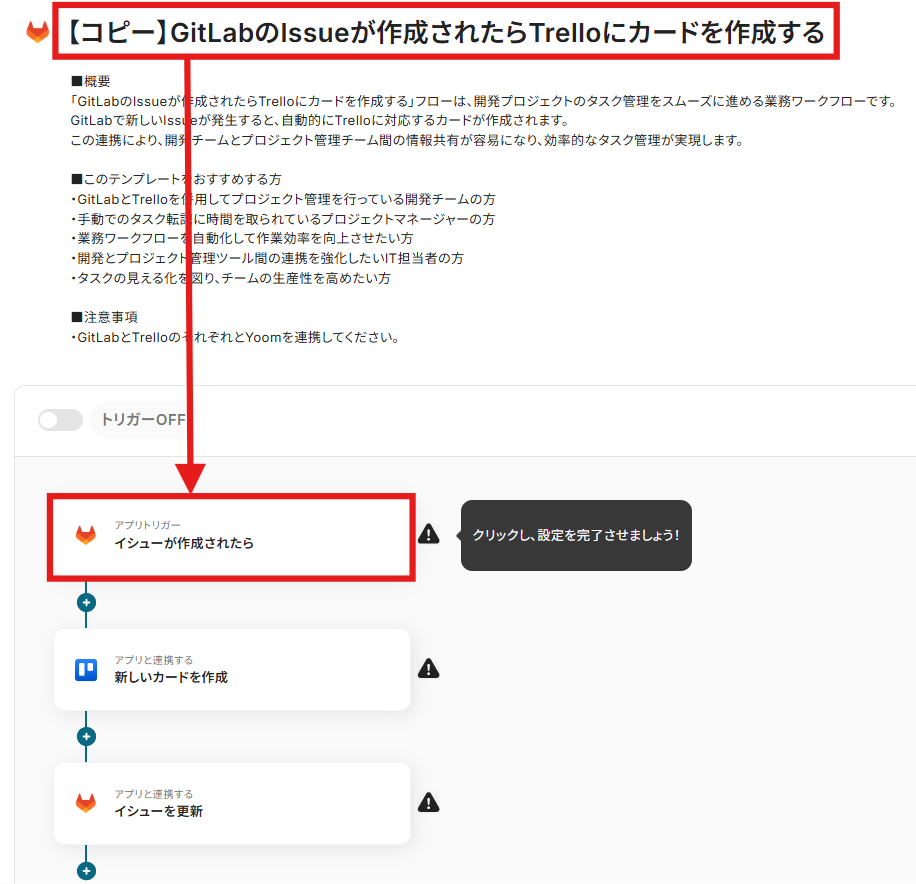 「GitLabのIssueが作成されたらTrelloにカードを作成する」フローは、開発プロジェクトのタスク管理をスムーズに進める業務ワークフローです。