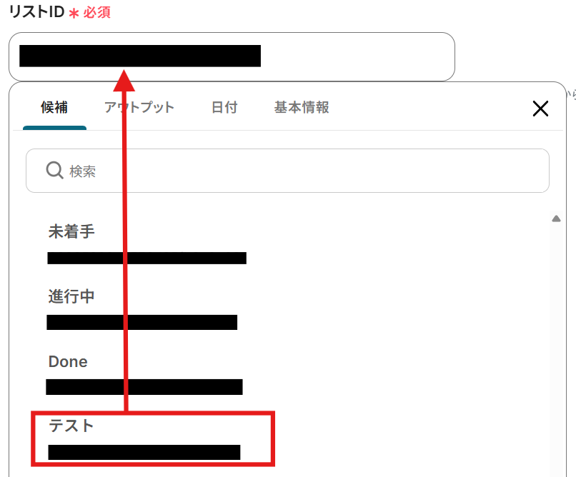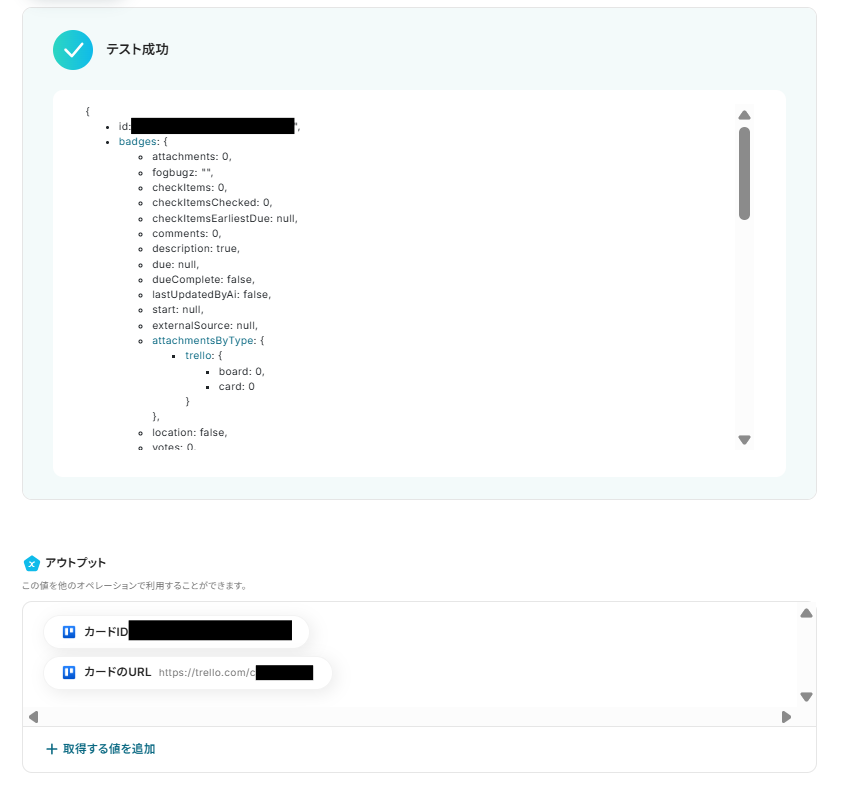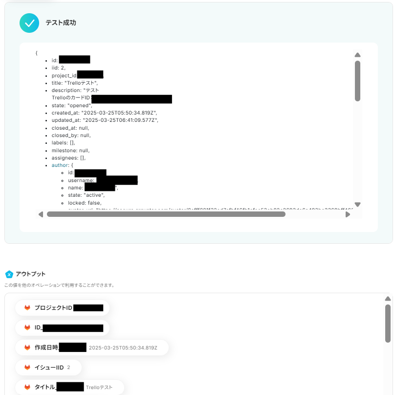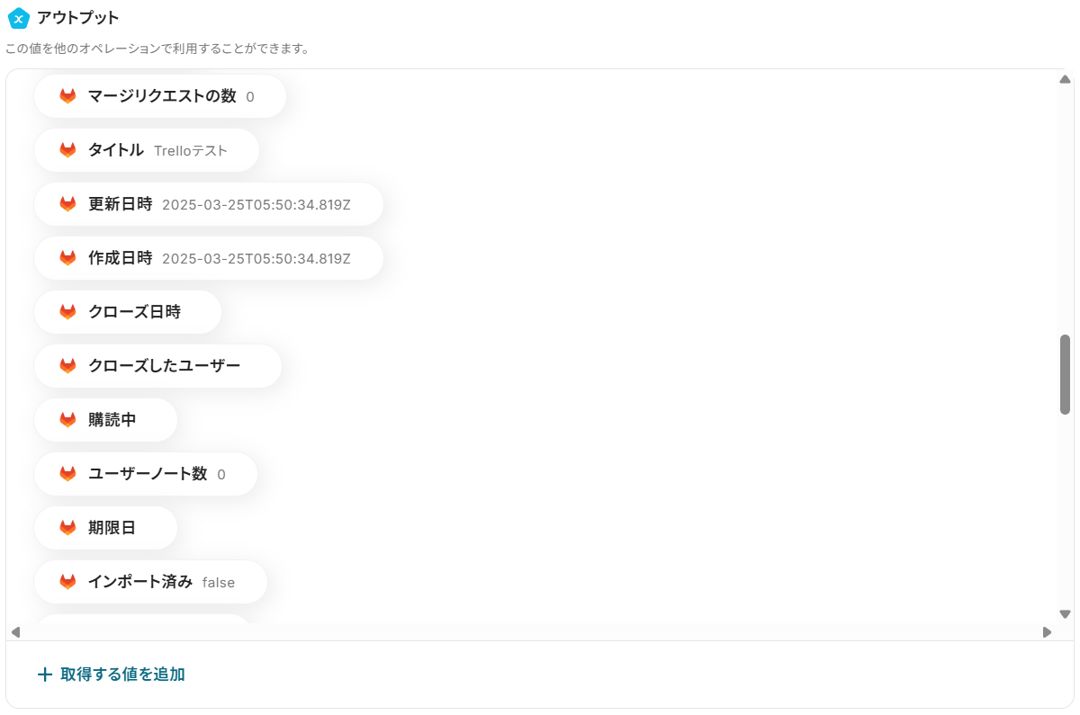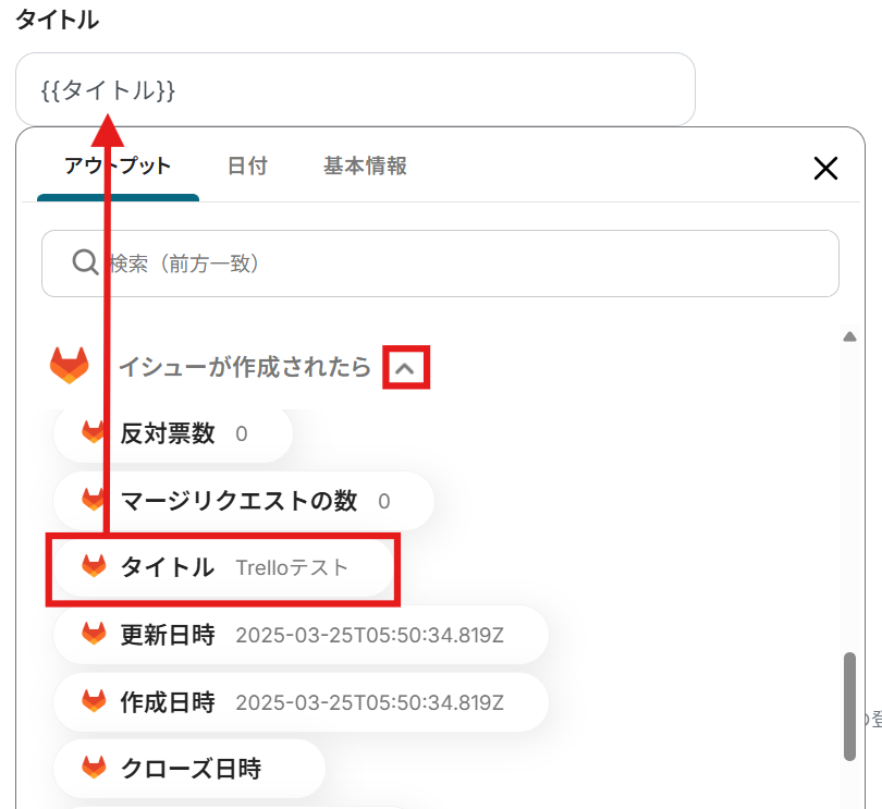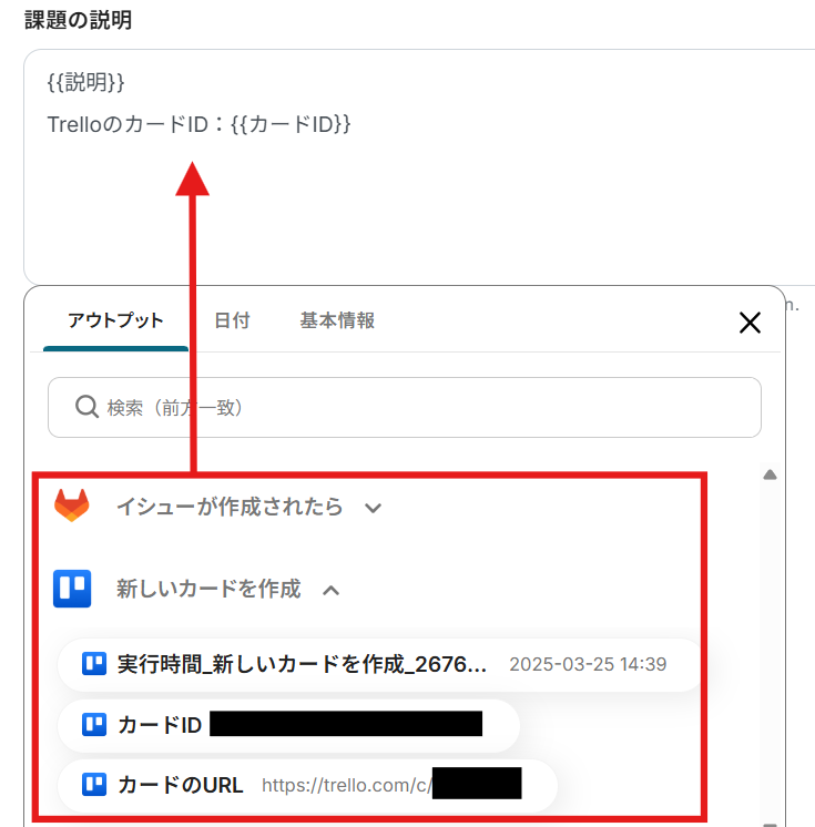 GitLabのアウトプットから「説明」を選択し、Trelloのアウトプットから「カードID」を選択しましょう。