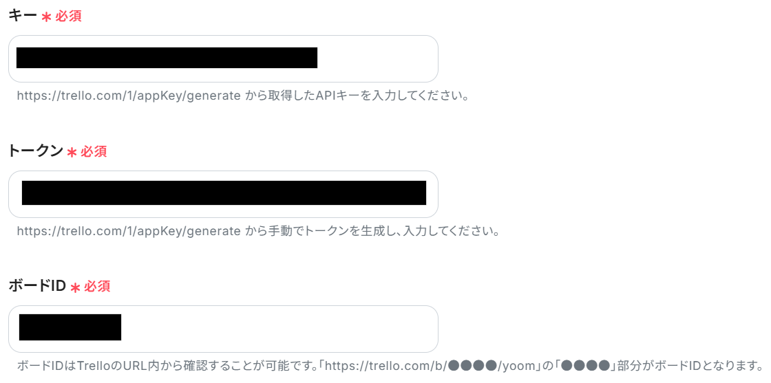 以下の画面が表示されたら、「キー」、「トークン」、「ボードID」を説明に従って設定してください。