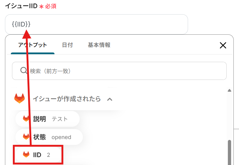 「イシューが作成されたら」のアウトプットから「IID」を選択しましょう。
