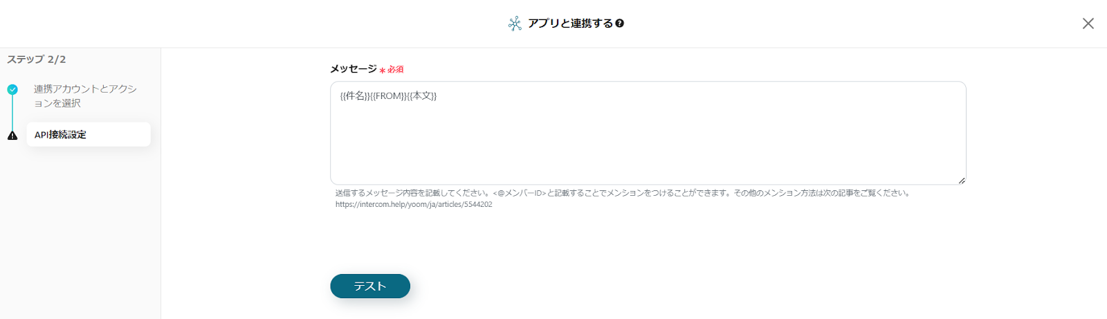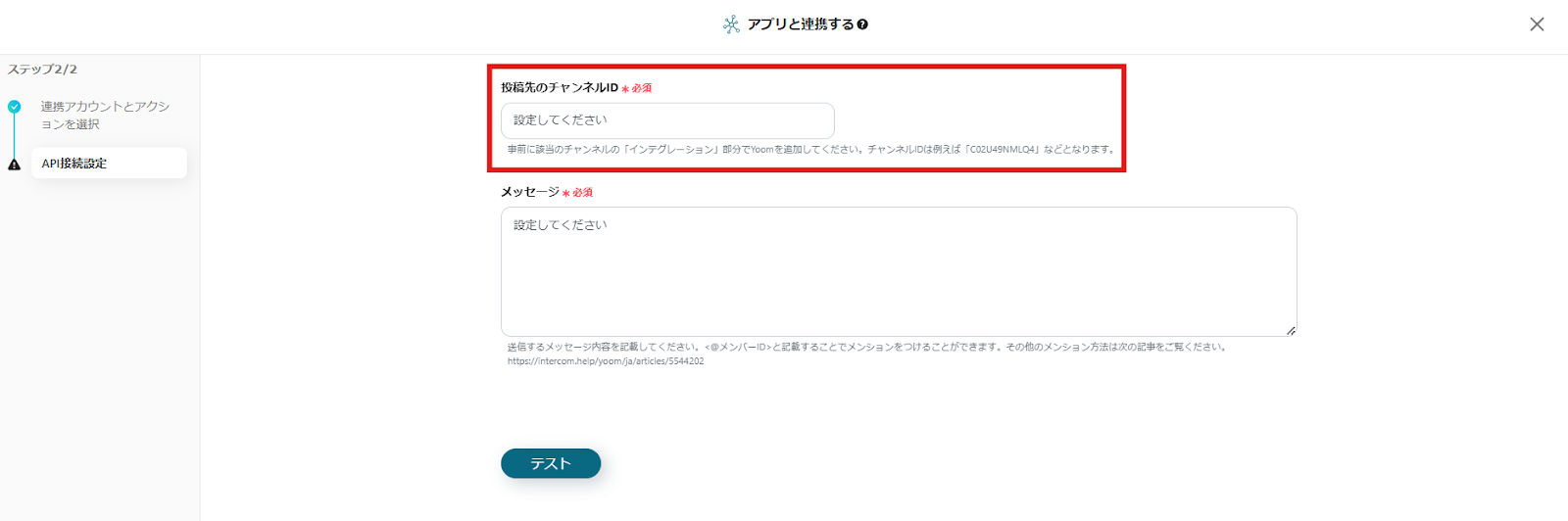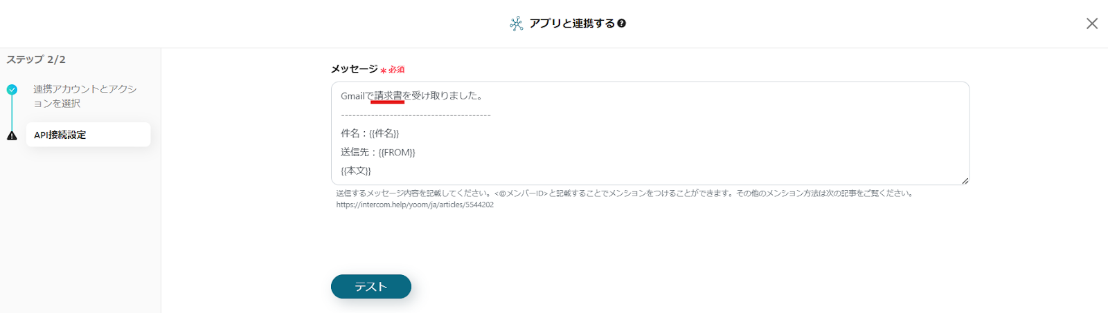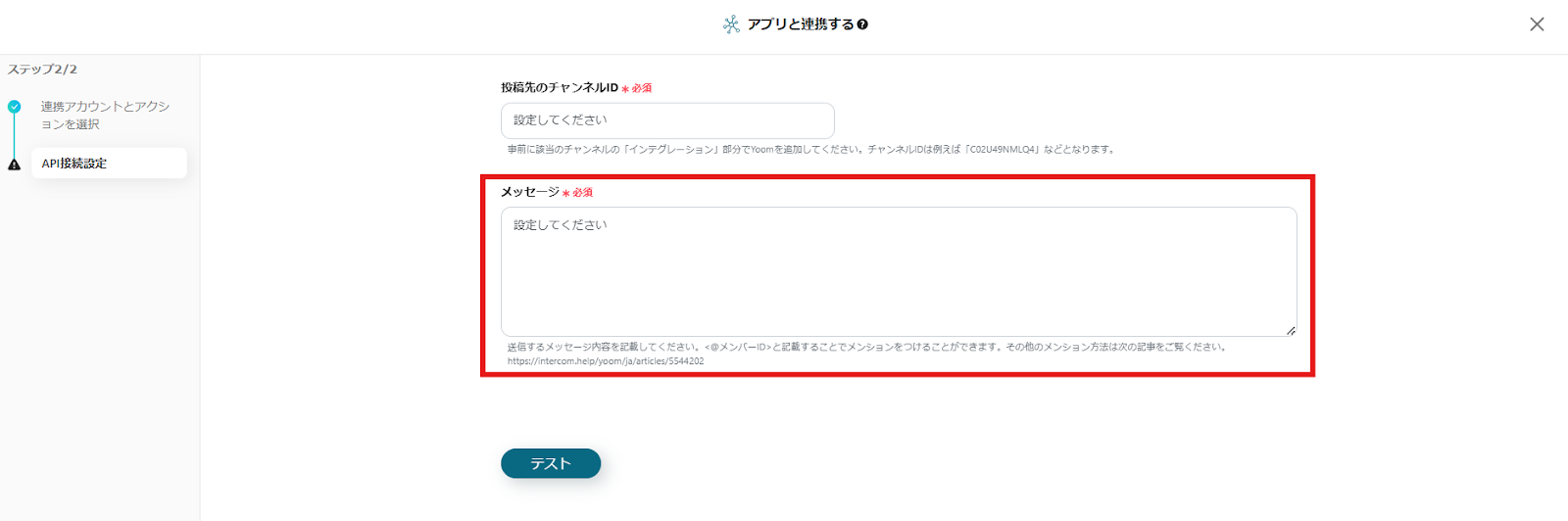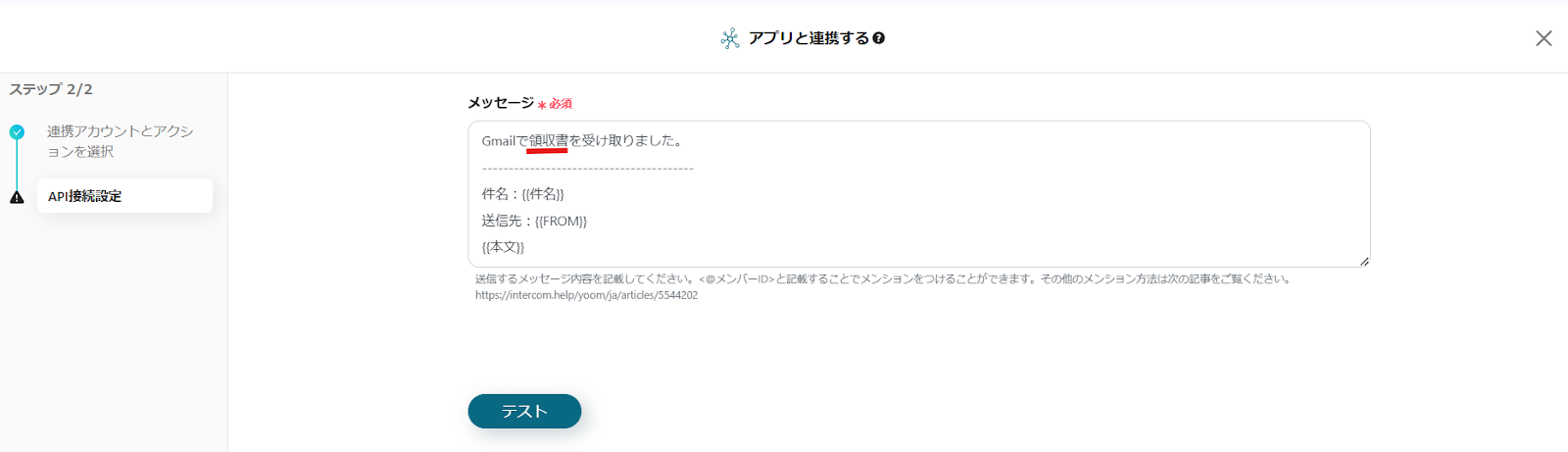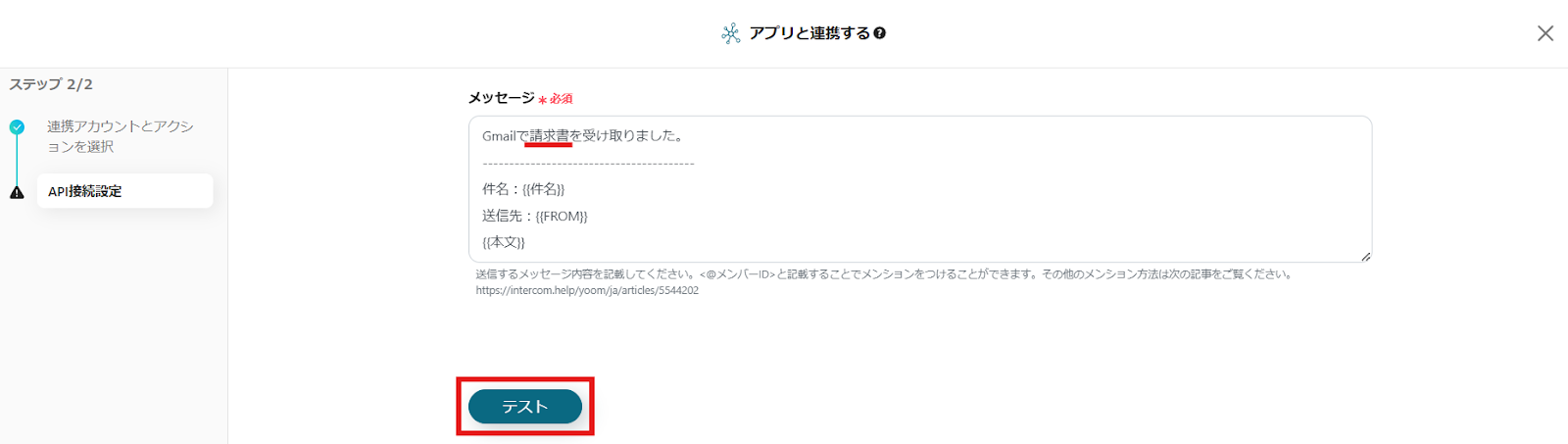 メッセージの設定ができたら、下部にあるテストボタンを押してください。