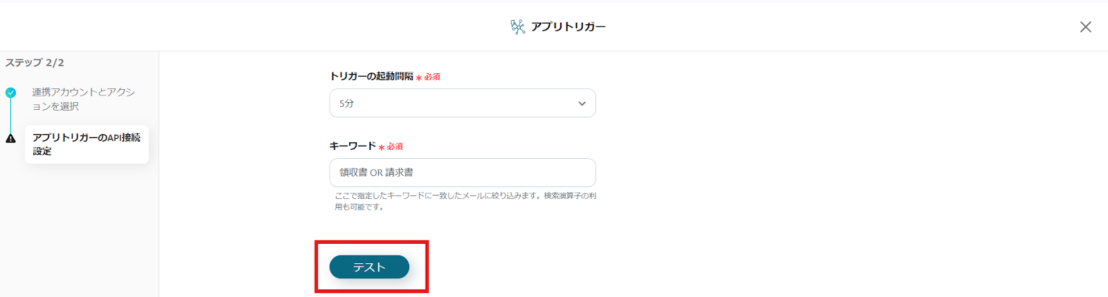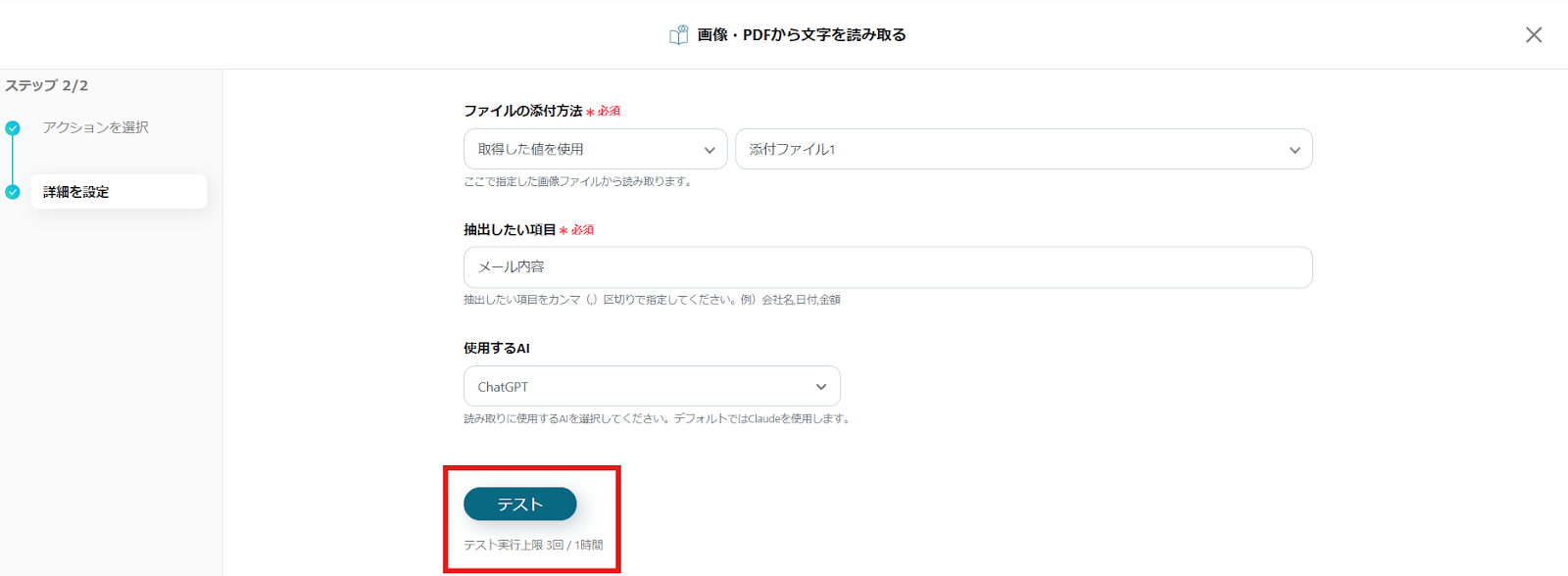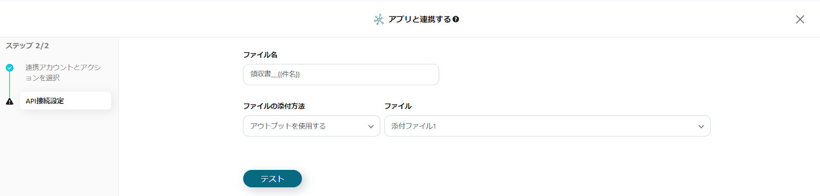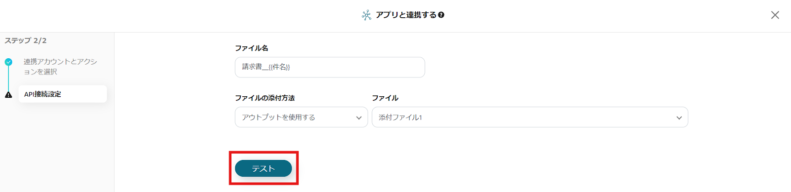 事前にテスト用のメールにダミーの領収書や請求書ファイルを添付し、送信しておきましょう。その後、テストボタンを押します。