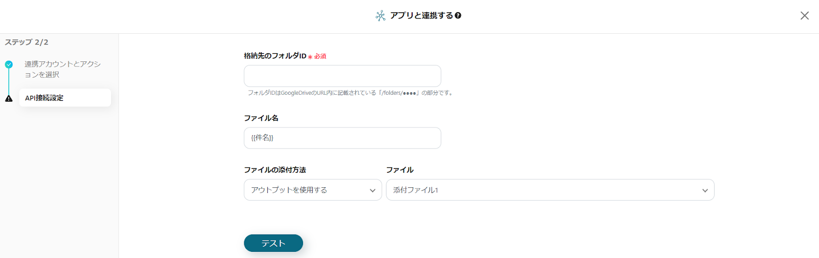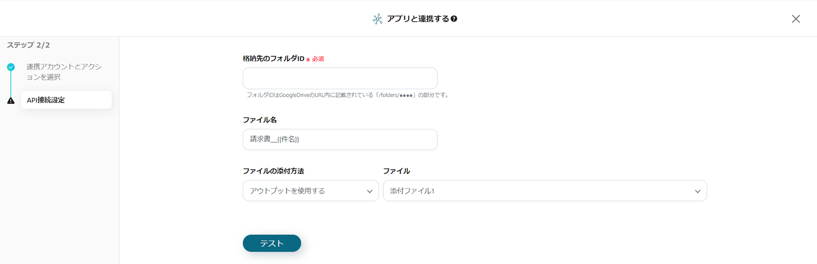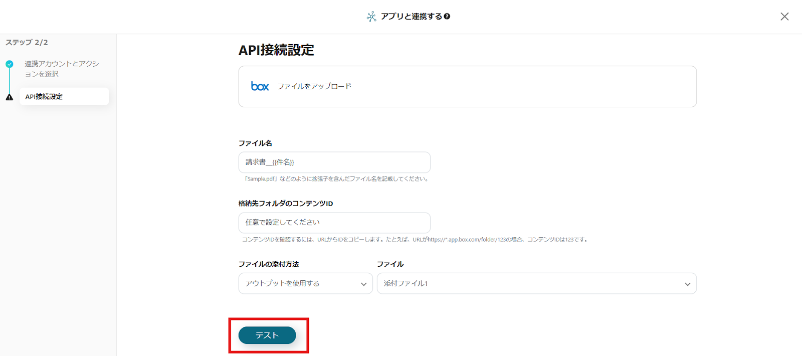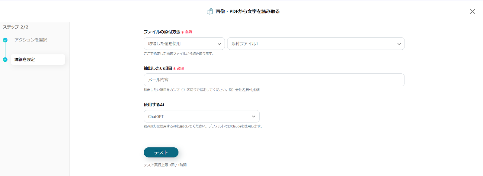 事前にテスト用のメールにダミーの領収書や請求書ファイルを添付し、送信しておきましょう。その後、テストボタンを押します。