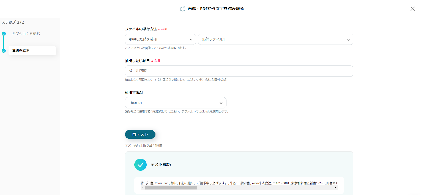 続けて、OCRでメールの内容を読み取る設定を行います。
