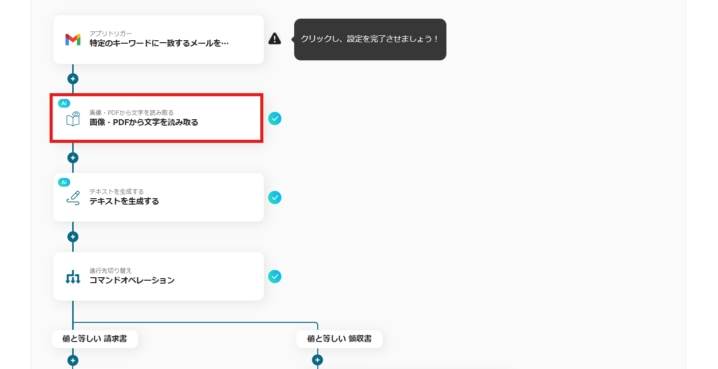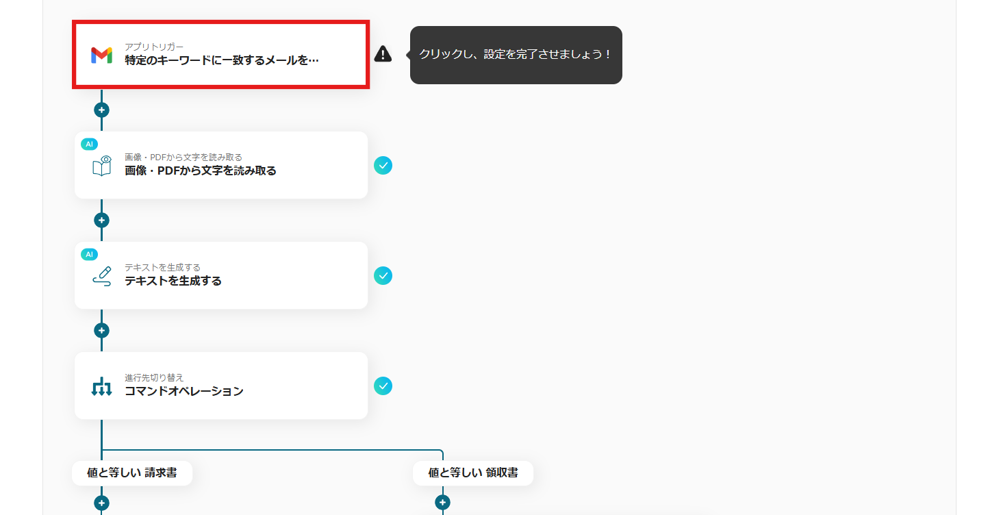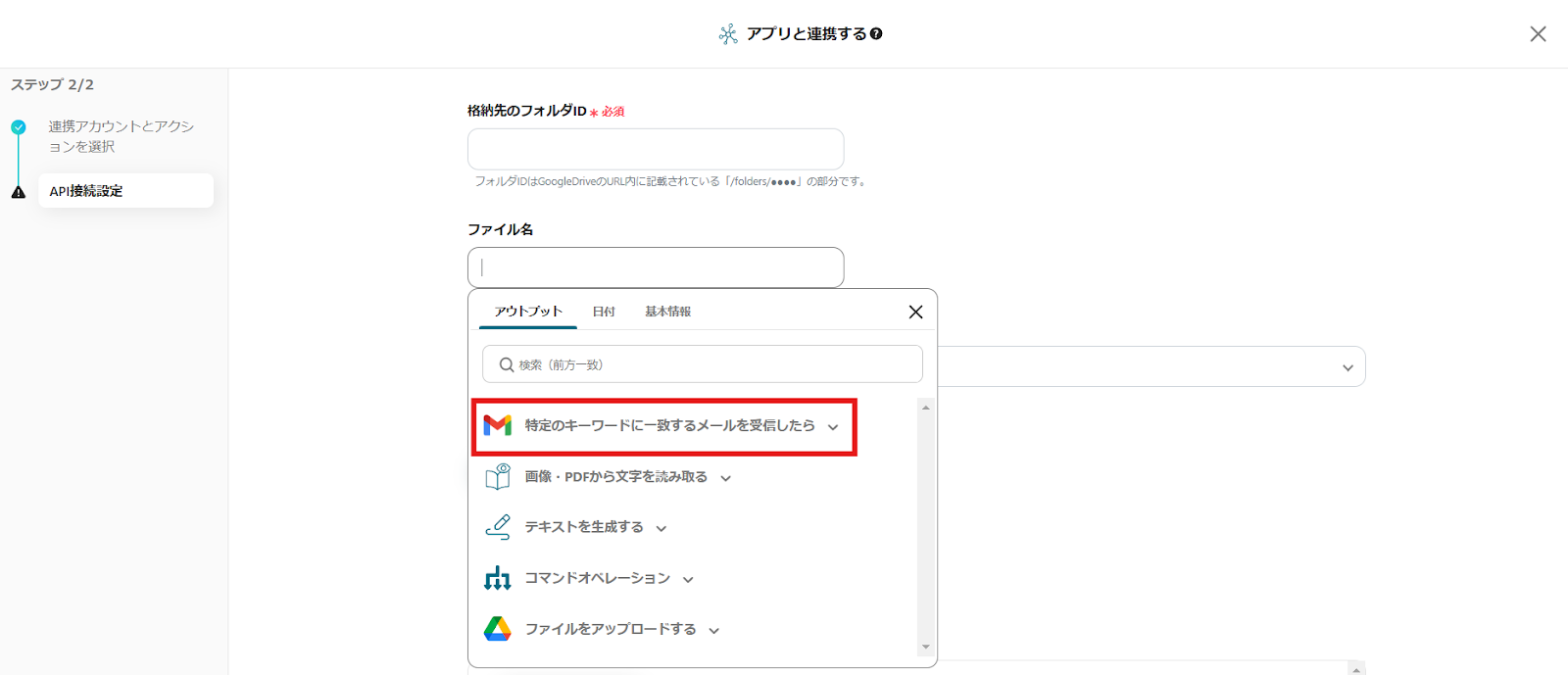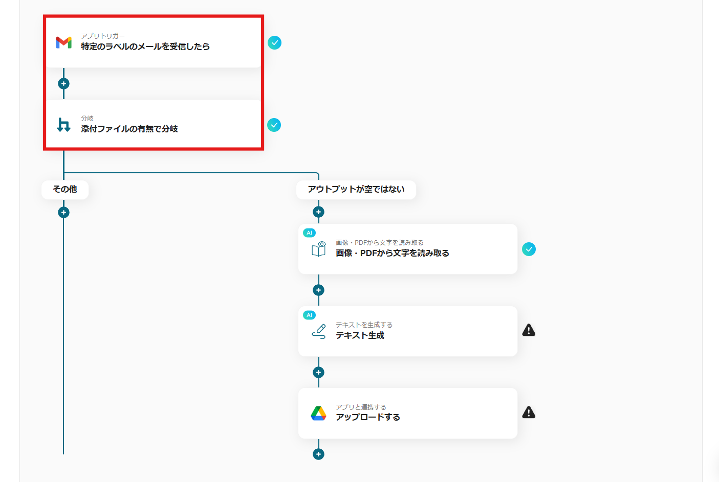 Gmailの添付ファイルをAI-OCRで読み取ることで、内容を識別することができ、それに伴った分岐を設定可能となります。これにより保存先のフォルダを分別可能です!