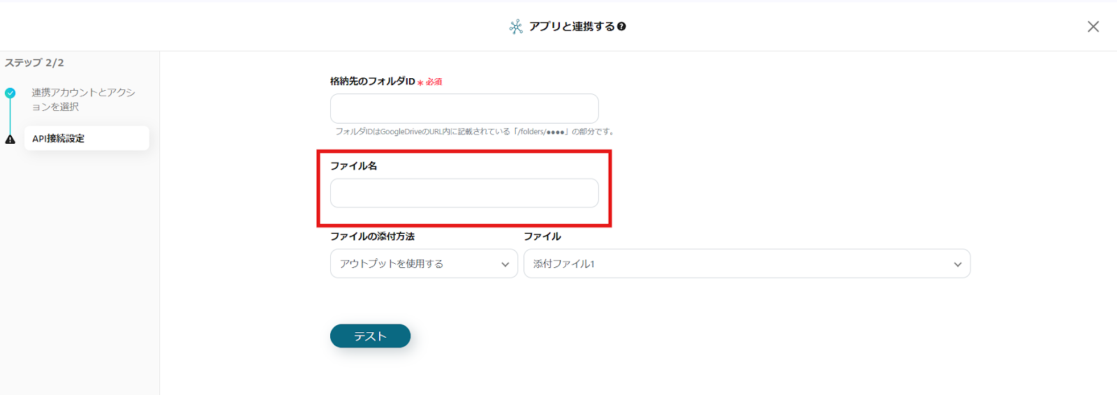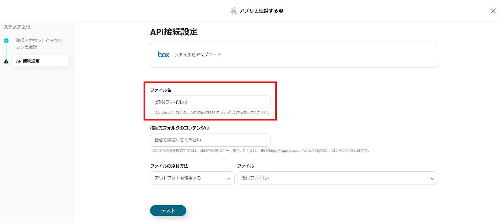 なお、ファイル名の部分も設定済みですが、先ほどと同じように件名を流用したり、文字を挿入することが可能です。
