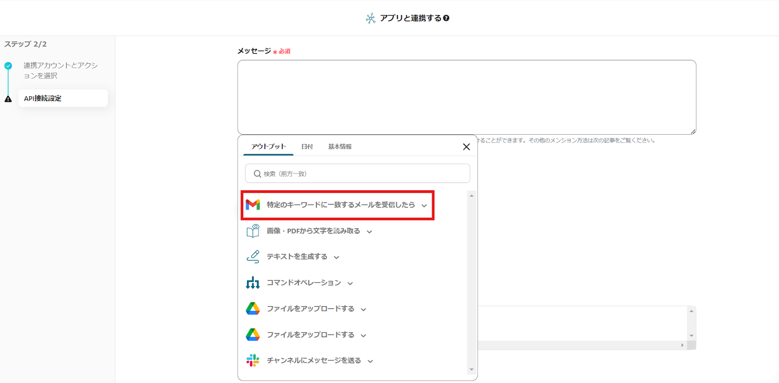 最後にGoogle DriveのAPIを活用して生成した言葉と添付ファイルを取得し、生成した言葉を基に「請求書」「領収書」などで分岐したうえで、指定したフォルダにアップロード可能です。