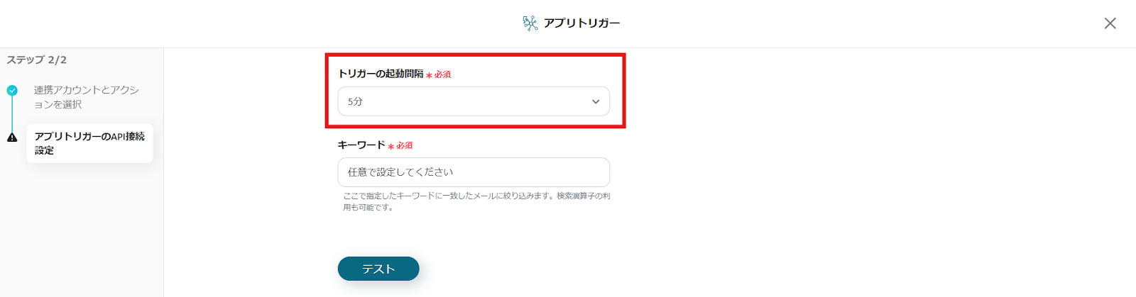 トリガーは5分、10分、15分、30分、60分の間隔で起動間隔を選択できます。
